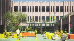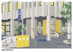 Hohen Stellenwert räumte die Jury den Arbeiten ein, die das Thema Partizipation und Aneignung bearbeiteten und sich nicht vorab auf Nutzungen festlegen wollten. Mingyan Wang und Weronika Kłósek-Gniewkowska legen den Schwerpunkt auf Innenhof und Dachterrasse, die mit Möbeln ausgestattet werden, damit die Aneignung leichter fällt. Der Innenhof wird mit zusätzlichen Ebenen so differenziert, dass über ihn das Gebäude leichter für neue Nutzungen erschlossen werden kann. Fhao + Studio Rapiet haben eine Videocollage möglicher Bürger:innenwünsche erstellt, die zur Grundlage eines partizipativen Planungsprozesses werden sollen. Amelie Steffen + Maximilian Atta schließlich schlagen vor, das Erdgeschoss in einen offenen durchlässigen Raum zu verwandeln und so neue Wege durch das Quartier anzubieten. Die Jury regte dies offensichtlich an, sich eigenständig die weitere Zukunft vorzustellen. „Einfach mal ganz unten anfangen. Reingehen. Gleich loslegen. Alle reinlassen. Schranken überwinden. Sich treffen und gemeinsame Wege finden. (…) Aus low-tech wird irgendwann high-tech und das Haus blüht auf, bis ganz nach oben! Sich von unten gemeinsam ganz hoch tasten“, so das Jurystatement.