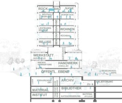 So finden sich Beiträge, die die wichtigen und viel diskutierten Themen der Zeit aufgreifen: Eine Arbeit schlägt vor, ein „Zentrum für Wasserwesen“ zu eröffnen, mit Wasserspeicher, Wasserfilter und einem Biotop für eine Vielzahl von Tieren und Pflanzen (Kollektiv für Wasserwesen). Das „Haus der Gerichte“ stellt die Frage zukünftiger Nahrungsmittelproduktion ins Zentrum. Nahrungsmittel werden angebaut, das Haus soll aber auch zu einem Ort der Wissensvermittlung, des Experimentierens und des Diskutierens werden (ATP München). Eine „Library of Repair“ könnte Kreislaufwirtschaft und Repairculture stärken und das Gebäude selbst zum Exponat der vorgeschlagenen Nutzung machen; Wohnen inklusive (Krater Fajan Kunst-und Architekturkollektiv). „Sorgende Stadt“ will die so wenig gewürdigte, für die Gesellschaft aber wichtige Care-Arbeit sichtbar machen – die Verfassenden (Mussoni Stölzl Architekt*innen) schlagen aber auch eine Strategie vor, wie vermieden werden kann, dass das Gebäude leersteht und beziehen dabei Freistaat, Stadt, Initiativen, Genossenschaften und das Mietshäuser Syndikat mit ein. Eine Hygiene-Center für Bedürftige ist Teil des Konzepts von Gabriel, Lenny und Nikolas (Wittelsbacher-Gymnasium), ein Casino soll hier die Finanzierung sicherstellen.