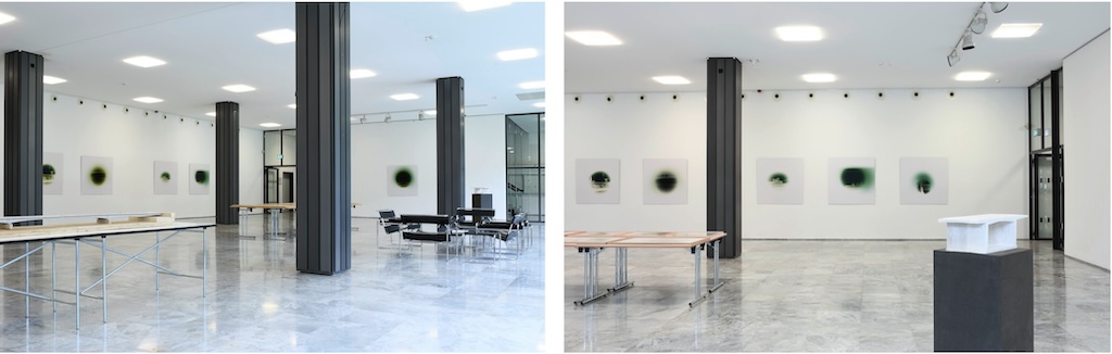21 Jahre später zeigen Daniel Lohmann, heute Professor für Baugeschichte und Denkmalpflege an der Architekturfakultät der TH Köln, und Philipp Goldbach, inzwischen Fotograf und bildender Künstler, die Bilder erneut. Sie hängen nun im nördlichen Foyer des ohnehin immer wieder einen Besuch lohnenden LVR-Landeshauses der Architekten Eckhard Schulze-Fielitz und Ernst von Rudloff unter Mitarbeit von Ulrich Schmidt von Altenstadt, zwischen 1956 und 1959 in Sichtweite der Deutzer Brücke unmittelbar am Rheinufer errichtet. Die Bilder zeigen mal vermeintlich Abstraktes, wie das Blattwerk einer der Platanen, die den Fluss säumen, mal sofort erkennbare Gebäude wie den Bayenturm oder das Schokoladenmuseum – allesamt durch die Fototechnik ins Grüne invertiert. Die Färbung der Aufnahmen führt nicht nur zu einem weiteren Grad der Abstraktion, sondern auch zu einer subtilen Analogie zum für die Stadt so typischen „Kölner Brückengrün“. Eine Farbe, so prägend, das selbst Architekturführer der Domstadt in sie eingeschlagen werden.