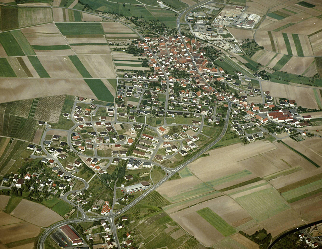 Fachsenfeld (Aalen), 1984. Im immer weiteren Bau von Einfamilienhausgebieten setzt sich eine Planungshaltung der Nachkriegszeit fort, die die vielen kleinen Orte im Land prägen. Viele der neuen Gebiete von damals sind zu den Problemen von heute geworden – die neuen von heute werden die von morgen sein. Alle Bilder dieses Beitrags: Landesarchiv Baden-Württemberg – Staatsarchiv Sigmaringen, Fotograf: Erich Merkler, CC BY 3.0.