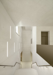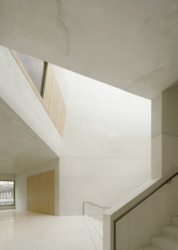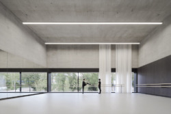 Dass die Treppenanlage nicht von oben bis unten durch das gesamte Gebäude führt, war nicht von Anfang an geplant. Sie endet, bevor sie den unteren Saal erreicht – auf Wunsch der Leitung des Hauses, damit keine Verbindung zwischen Aufführungssaal und Schule besteht. Dieser untere Saal ist mit einem kleine Foyer ausgestattet, hat außen einen Balkon zur Stadt auf der ersten Geschossebene. Leider entspricht diese spätere innere Änderung auch einer äußeren: Im Wettbewerb war auf dem Grundstück noch parallel zur Schule ein öffentlicher Weg vorgesehen – ihn gibt es zwar, doch er wird nicht öffentlich sein dürfen. Zu groß war die Angst der Schule, die großen Fenster könnten Voyeure anlocken. Doch noch hat man sich nicht endgültig geeinigt – immerhin hatten Stadt und Land den öffentlichen Weg 2015 vertraglich vereinbart.