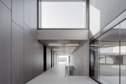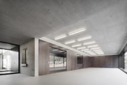 Der Qualität der Architektur tut dies aber keinen Abbruch. Mit einer bewundernswerten Konsequenz gelingt es den Architekten, die Klarheit der Struktur auch in der Konstruktion abzubilden. Bauweise und Gestalt, Material und Atomsphäre werden als Einheit verstanden und inszeniert. Die sorgfältige geplante und ausgeführte Betonkonstruktion, zweischalig an den Außenwänden und einschalig im Innenbereich, nimmt die Technik auf, die so nicht als ein Zusatz erscheint oder verkleidet werden musste: Elektroinstallation, Sprinkleranlagen, Betontemperierung und Entwässerung. Die Materialien sind so wenig wie möglich verfremdet oder gestrichen. Das ist gleichzeitig Aussage wie Prinzip: Architektur erhält ihre Qualität aus den Bedingungen heraus, aus denen sie produziert ist und nicht durch eine ergänzte und verändernde Schicht, die ersetzt werden könnte. Der Sichtbeton wird durch Elemente ergänzt, die durch ihre Eigenqualität wirken: Lackiertes Holz innen und eloxiertes Aluminium außen für die Glasrahmen, teilweise mikroperforierte Holzverkleidungen, PUR-beschichtete Fußböden. Verglasungen und Durchgänge sind geschosshoch, Rahmen werden flächenbündig eingesetzt.
