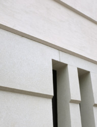 Dass die Fassade nur im Sockelbereich und in den Wandungen der Öffnungen mit Sichtbeton, darüberhinaus in einer cremefarbigen Putzhaut versehen wurde, ist dem Kostendruck geschuldet gewesen, schadet aber letztlich der Wirkung nur wenig.