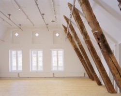 Vor inzwischen 25 Jahren war die zuvor der benachbarten Schule zugehörigen Sporthalle, ein Gebäude aus dem frühen 20. Jahrhundert, dem Museum zur Verfügung gestellt worden. Sie hatte bislang als Vortragsraum, als Forum gedient. Reichel Schlaier verlegten den Haupteingang, der zuvor direkt in die ehemalige Klosterkirche geführt hatte, in dieses Forum. Den sich im Westen anschließenden Raum hinter dem Forum, zwischen Stadtmauer und Westportal der Kirche, schlossen sie mit einer weißen Konstruktion aus Holz, Stahl und Glas, die den Bestand noch gut lesbar lässt. Die so gewonnene, großzügigen Halle fungiert nun als Foyer, als Start wie Ziel des Museumsrundgangs, der mit dem Betreten der Kirche von Westen beginnt.