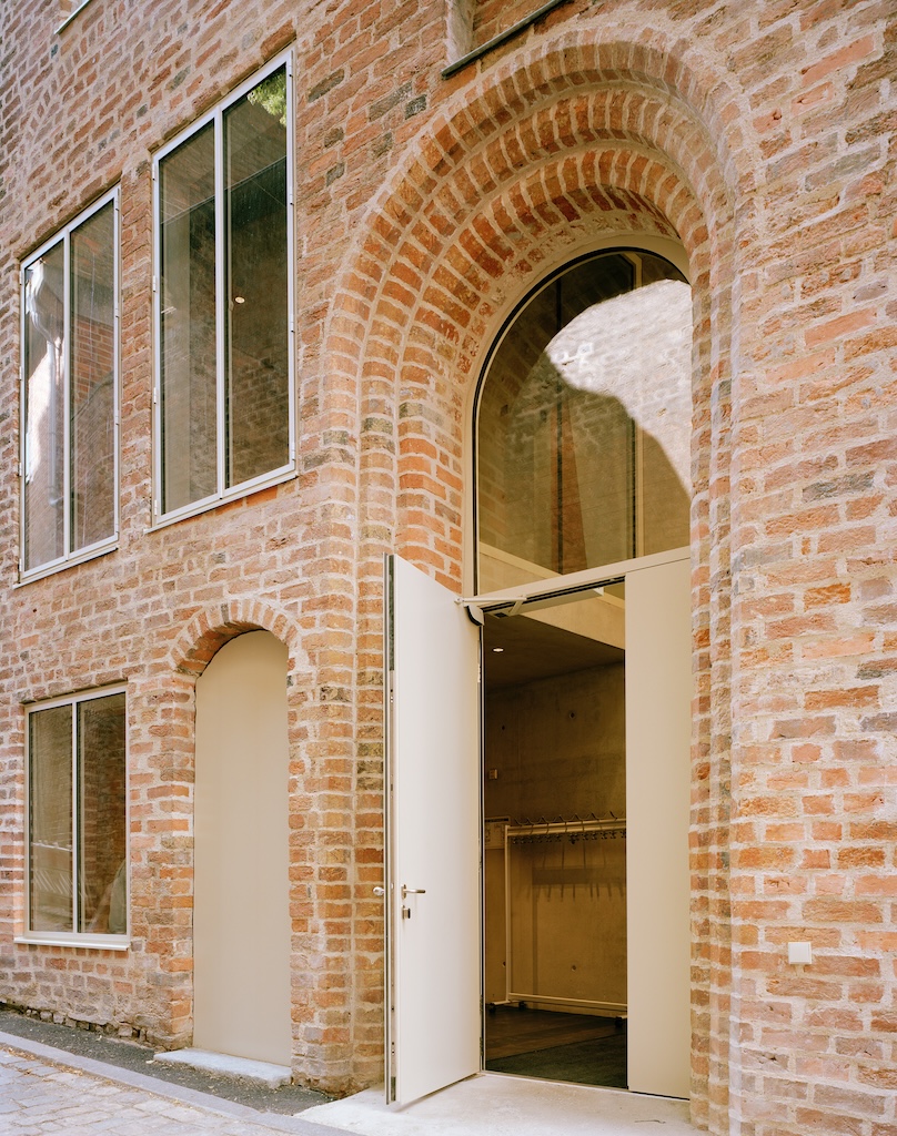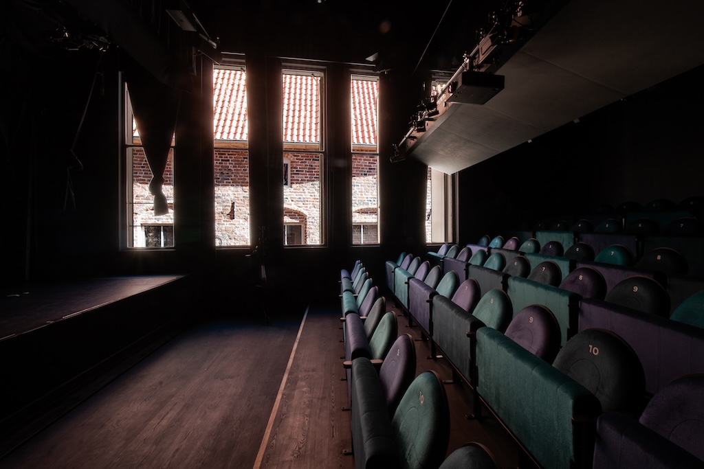 Ergänzt wird dieser Komplex durch mit Büros für Verwaltung und Leitung sowie Gastwohnungen ausgestattete Bestandsbauten im Westen – insgesamt wurden hier letztlich acht Häuser zu einem funktionalen Komplex verbunden, wahrlich ein Konglomerat. Die schmucklose Ziegelfassade, die sehr dezent Anleihen bei den Fassaden des Quartiers aufnimmt, betont die körperlichen Klarheit des Neubaus und tritt so in ein Spiel mit seinen Nachbarn ein, in dem sich die unterschiedlichen Fassaden gegenseitig stärken. Die Kubatur ist lediglich durch einen vorstehenden Mauerwerksstreifen (der eine Bauwerksfuge geschickt kaschiert) akzentuiert, dazu kommen wenige bogenförmige Öffnungen, eine große, mit der die Bühne im Obergeschossd angedient werden kann und vier Meter hohe, schmale Fenster im Theatersaal, die mit Läden geschlossen werden können – und so anzeigen, ob im Innern Theater gespielt wird oder nicht.