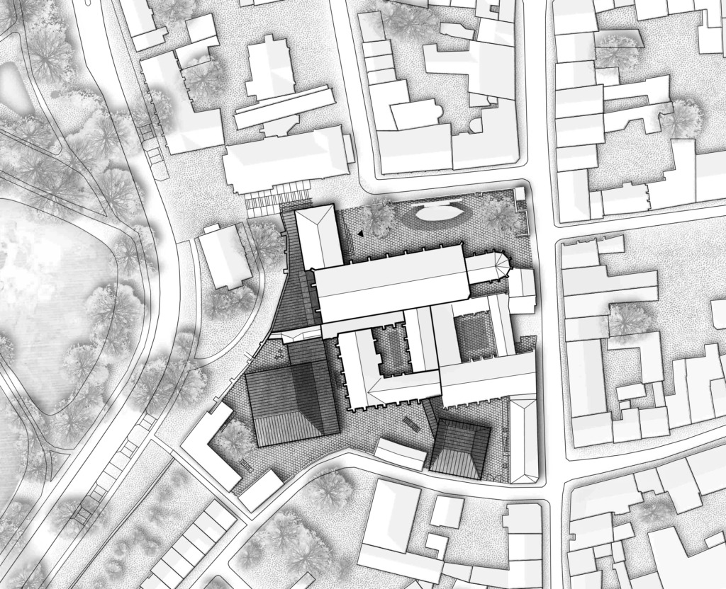 Sowohl im Westen, als auch im Süden wurden bestehende Häuser durch Neubauten ersetzt und mit den bestehenden im Innern zu einem Komplex verbunden – im Westen nimmt ein schmaler Anbau nun das Treppenhaus ab dem ersten Obergeschoss, WCs, Garderobe und ein Fluchttreppenhaus auf; der andere, deutlich präsentere im Süden beherbergt das neue Theater und im Erdgeschoss einen das Foyer erweiternden Multifunktionsraum, in dem aktuell eine Medieninstallation zusehen ist. Dieser Neubau ist neben dem Tausch der zweite entscheidende strategische Schachzug, mit dem der Entwurf sich durchgesetzt hatte. Nun hat das Theater mit Galerie Platz für 125 Gäste.