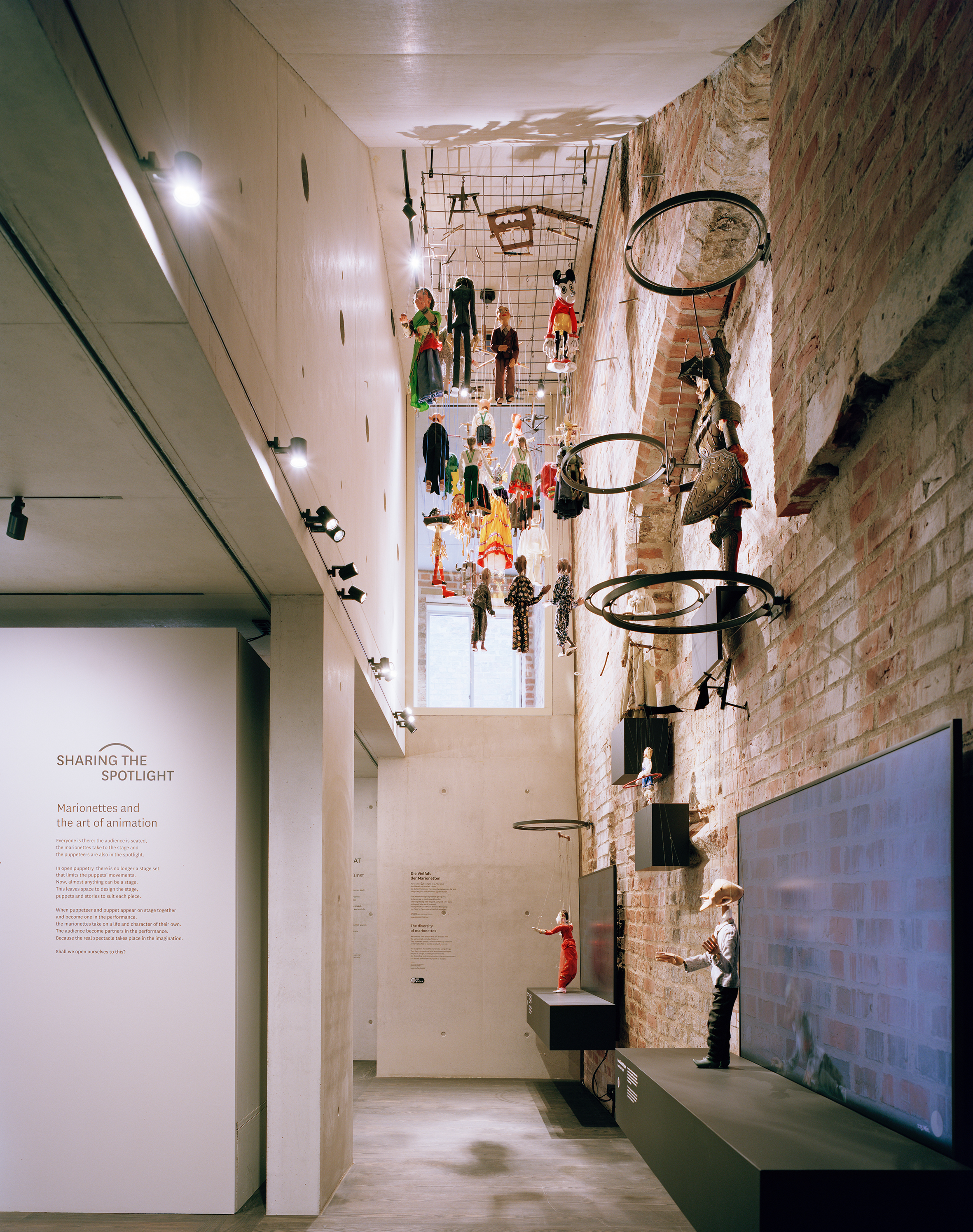 Ganz dem Museum gewidmet ist das jenseits der Kleinen Petersgrube liegenden Gebäude Kolk 20/22. Die Grundlage dieses Museums bildet ein aus einer Sammlung von Figuren aus der ganzen Welt aufbauenden Bestand, der letztlich auch zur Einrichtung des Theaters vor etwas mehr als fünfzig Jahren geführt hatte. Die Possehl-Stiftung, die sich für das Lübecker Stadtbild und die Altstadtarchitektur engagiert, ist an dieser Geschichte – und am Projekt selbst – maßgeblich beteiligt. Hier, im Museum, stand nur die Backsteinfassade unter Denkmalschutz; die Architekten machten sich das zunutze, es zu entkernen und ein Museum nach dem Haus-im-Haus-Prinzip zu konzipieren – sowohl organisatorisch als auch haustechnisch eine mehr als plausible Lösung, die zudem die historische Außenwand auch innen erlebbar macht – in aller Unregelmäßigkeit, die das Einpassen des Neuen zur echten Herausforderung gemacht hat. Ein Ringanker stabilisiert die historische Außenwand, eine nach dem Prinzip der Doppehelix konzipierte Treppenanlage erschließt die Ausstellungsräume im Innern, die Besuchende in die weltweite Tradition des Figurentheaters einschließlich ritueller Bräuche einführt. Auch hier ist das Neue als sorgfältig geplanter und ausgeführter Sichtbeton unmittelbar erkennbar. Großformatige Durchblicke etwa vom Umlauf des ersten Obergeschosses in das Museumsfoyers erleichtern die Orientierung im komplexen Raumgefüge. Das Museum ist in gewisser Weise die nach Innen gewendete Gestaltungskonzept des Theaters: Während dort der Kontrast zwischen Alt und Neu vor allem im Außen als rhythmisierende und belebende Fortschreibung des Ortes, als kraftvolle Geste wirkt, ist es hier im Museum der eigenständige Innenkörper, der in spannungsvollem Dialog zum Alten tritt. Das feine Verweben, das den Gesamtkomplex prägt, innen wie außen, wird so durch eine selbstbewusste Setzung betont – und stärkt so maßgeblich den Ort, der nicht im Wortsinne etwas im Schatten des Petrikirchplateaus liegt.