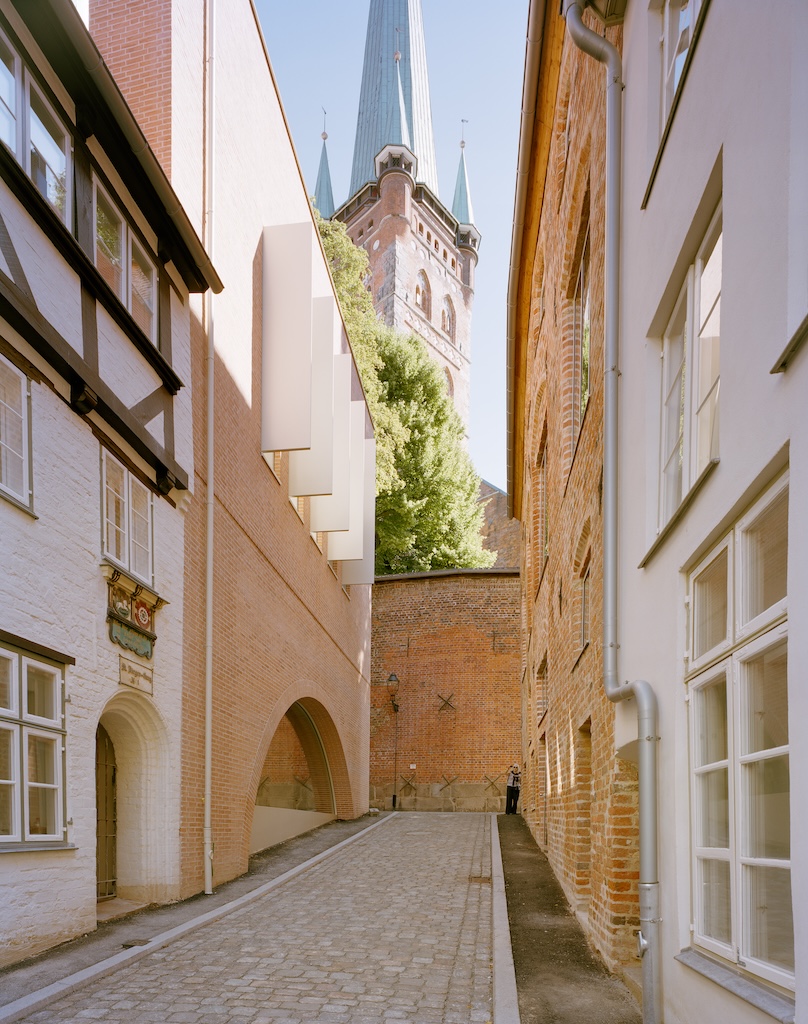 Durch diese räumliche Neuorganisation kann sich das Foyer im Altbau zum großzügigen Raum freispielen, die historischen Deckenbalken wurden freigelegt, das im letzten Jahrhundert verbaute gotische Portal und das dazugehörige Dielenfenster wurde nach Befund wiederhergestellt, die Konstruktion durch Stahlträger ergänzt, historisches Mauerwerk saniert und durch neues ergänzt. Im Neubau dominiert Sichtbeton, bis ins erste Obergeschoss ist die Konstruktion in Stützen aufgelöst, die die historische Außenwand sichtbar lassen und wegen des Baugrunds eng stehen müssen. Dass im Grund auch Reste eines Backsteinhauses gefunden wurden, hat die Fertigstellung des Projekts etwas verzögert – immerhin gehören sie zum ältesten bislang bekannten Ziegelbau Lübecks.