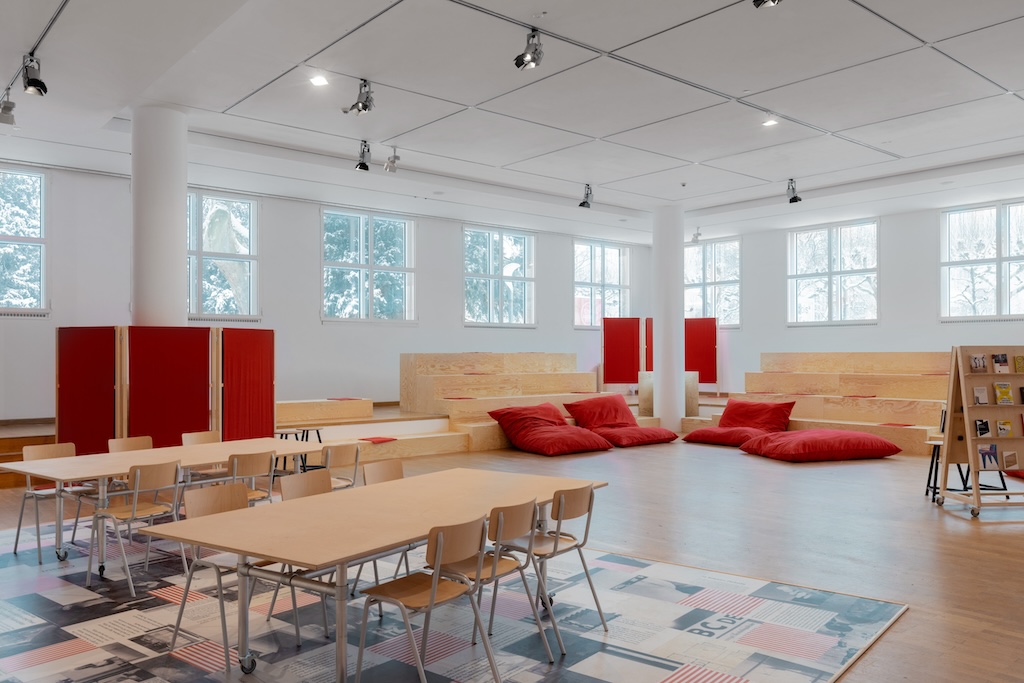 Nele Heise: Der WDC Hub ist ein klassischer Designauftrag. Das war kein partizipativer Prozess. Das WDC Team wurde auf uns aufmerksam, weil wir zwei Projekte beim Open Call eingereicht haben, die wir dieses Jahr auch umsetzen werden. Wir haben uns zu Beginn zwei Tage vor Ort mit dem WDC Team zusammengesetzt und haben alles erfragt, was es an Wissen und vorhandenem Material gibt. Der WDC Hub wird das ganze WDC Jahr über als Festival-Zentrale fungieren. Hier können Projekte stattfinden, Ausstellungen, Initiativen können sich dort präsentieren. Und das alles kostenlos und zu Museumsöffnungszeiten zugänglich. Wir konnten Ausstellungsobjekte wiederverwenden wie die Platten von der Ausstellung „Yes, we care“ für den Boden, von der Jazzclub-Ausstellung den Stoff.