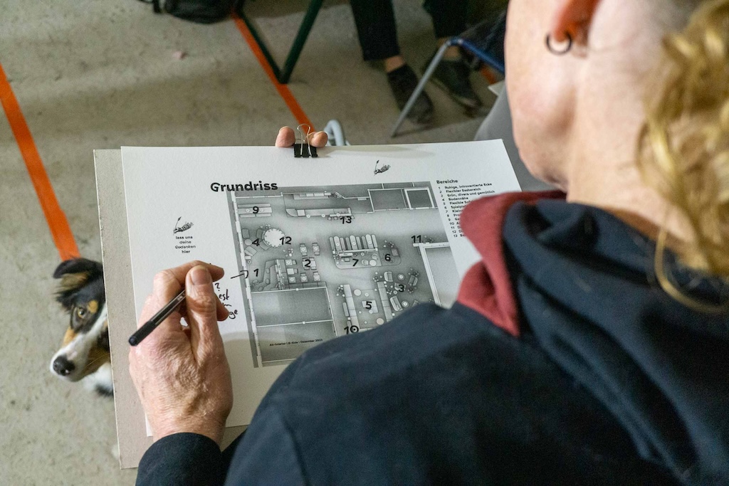 Allerdings hat das Kollektiv rund 200 Mitglieder, was eine große Herausforderung war, deshalb haben wir viele Iterationsschleifen auch im digitalen Raum stattfinden lassen. Dazu gab es aber auch fünf analoge Events, bei denen wir mit Knete und Pappmodellen nach dem Emotional Mapping-Ansatz nach Christopher Alexander gearbeitet haben. Dabei haben Menschen ihre Gefühle kartiert, die sie im Rohbau des Quartierszentrums hatten. Es gab auch eine Mock-up-Party, bei der wir die Theke aus Pappe gebaut und dann abends mit Glühwein eingeweiht haben.