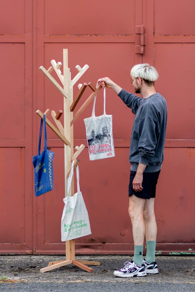 Der „Mehrwegbeutelbaum“ spendet in Supermärkten Jutebeutel für Menschen, die ihre vergessen haben. (Bild © Studio Formagora)