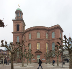 Zwischen Hochhäusern verzwergt: Die wiederaufgebaute Paulskirche ist der Ort, an dem die junge Republik sich politisch und kulturell selbstkritisch und auf intellektuell hohem Niveau an die Öffentlichkeit richtete und stets – etwa mit der Verleihung des Friedenspreises, den der Börsenverein des Deutschen Buchhandels jährlich vergibt – weiterentwickelte. (Bild: Ursula Baus)