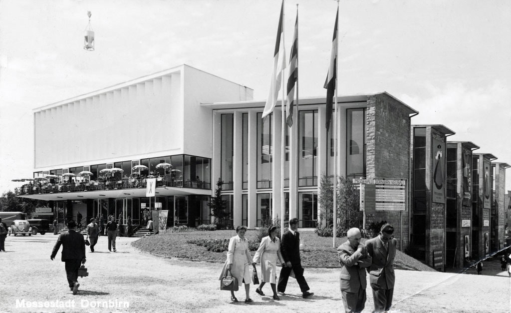 Gesamtansicht der neuen Messehalle Dornbirn, nach 1954, Postkarte Hellensteiner © Stadtarchiv Dornbirn. Beide Abbildungen sind dem rezensierten Buch entnommen.